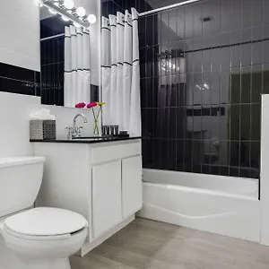 Views of the city are featured in certain rooms. There are also a higher level toilet, a bath, and a lower bathroom sink in the bathrooms.